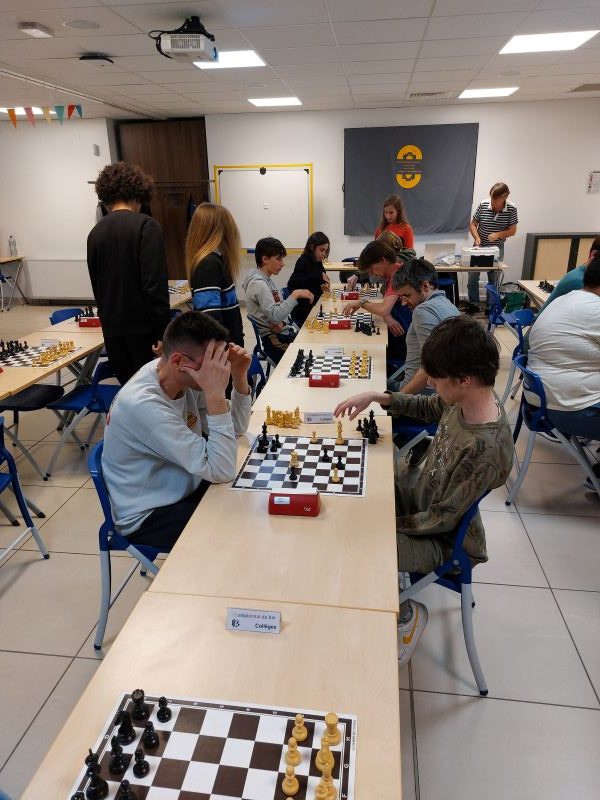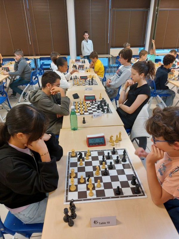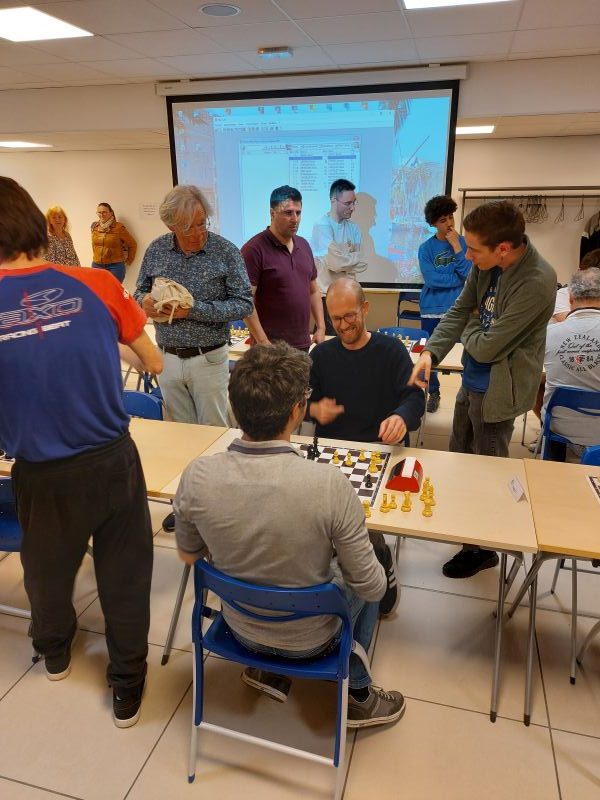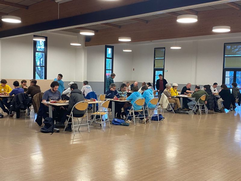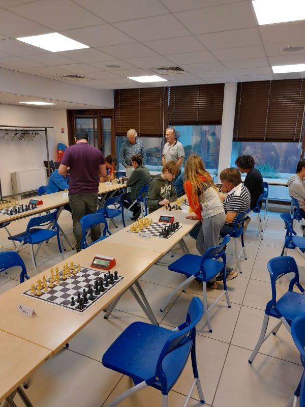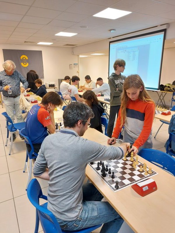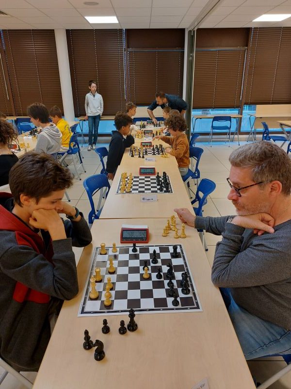 A peine les pizzas du vendredi soir digérées, nous recommençons dès le samedi matin avec cette fois un tournoi rapide en cadence 8min+3s. Les jeunes et (beaucoup) moins jeunes sont mélangés ce qui donnent des appariements parfois anachroniques.