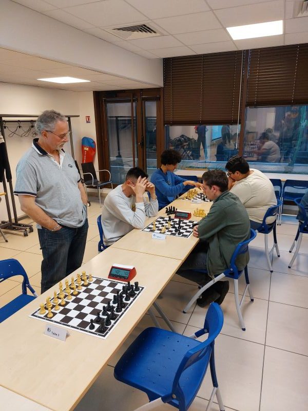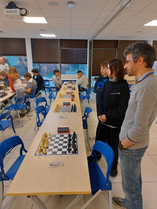 La première ronde se passe bien puisque nous gagnons 3/1 assez facilement. Clément commence la compétition en se prenant un mat du berger 😎, Charlie et Elian gagnent facilement leurs parties et Louis parvient à battre Liam, un des deux gros ELO de Carqueiranne.