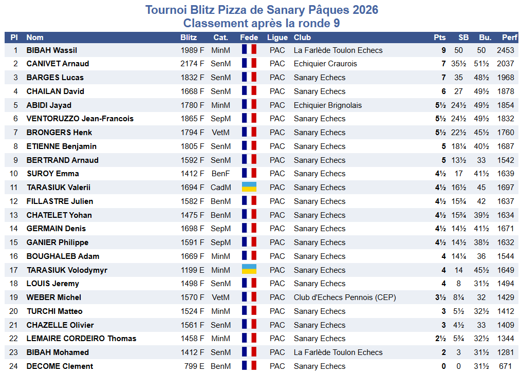 Le tournoi est brillamment remporté par Wassil Bibah de La Farlède Toulon Echecs avec une perf à 2453 Elo !!! Bravo Wassil !